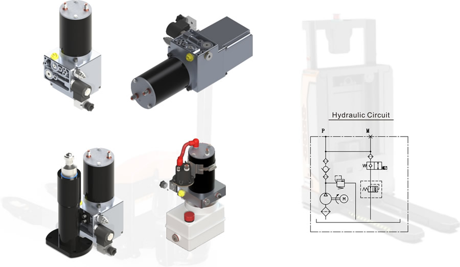 此動力單元專為全電動托盤車所設計。它們具有升高、保持及下降功能,通常用于單作用缸。內(nèi)置壓力補償節(jié)流閥用于控制下降速度。有從0.3KW-1.2KW不同的電機功率,鋁壓鑄一體、鐵制及塑料油箱和單元油缸一體等款型供選用,基本涵蓋市場上所有車型。
